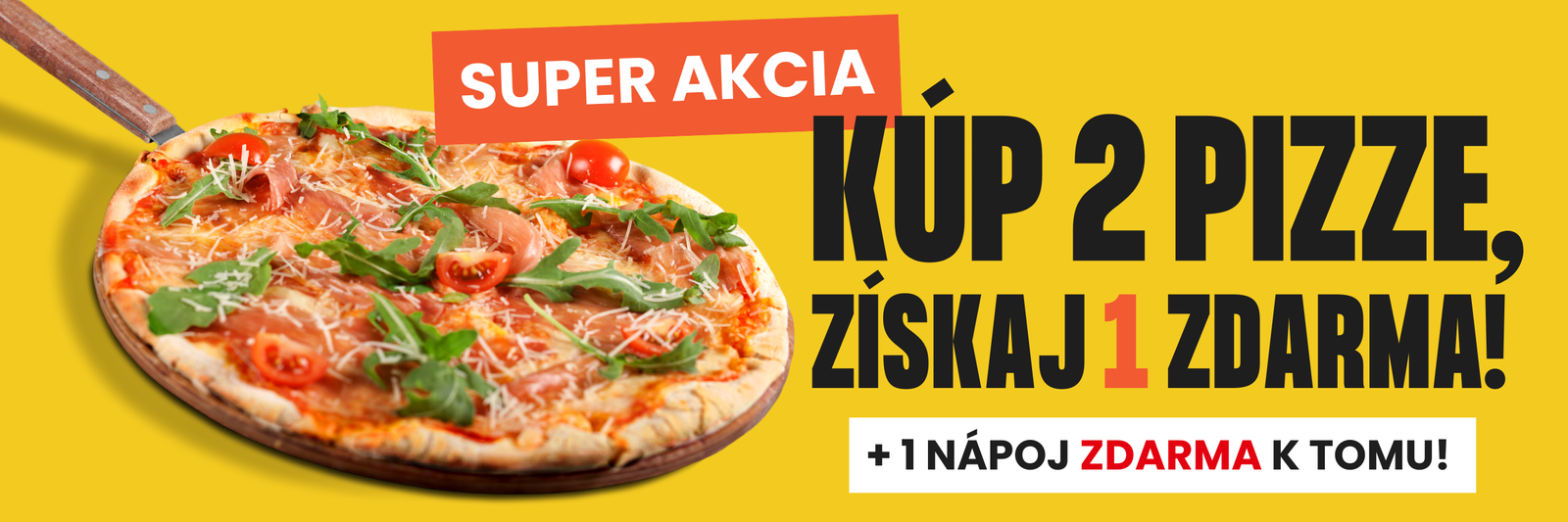 Milí zákazníci máme pre Vás SUPER akciu. Kúp 2 pizze a tretiu dostaneš spolu s nápojom ZDARMA!